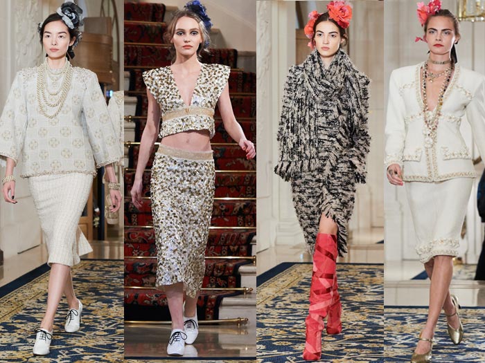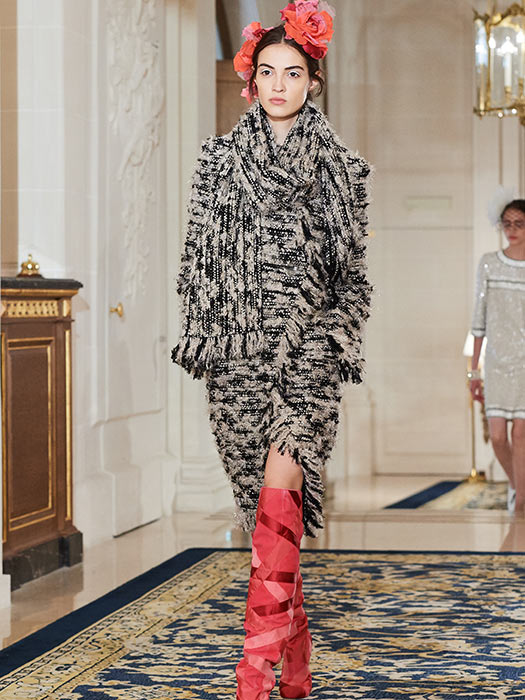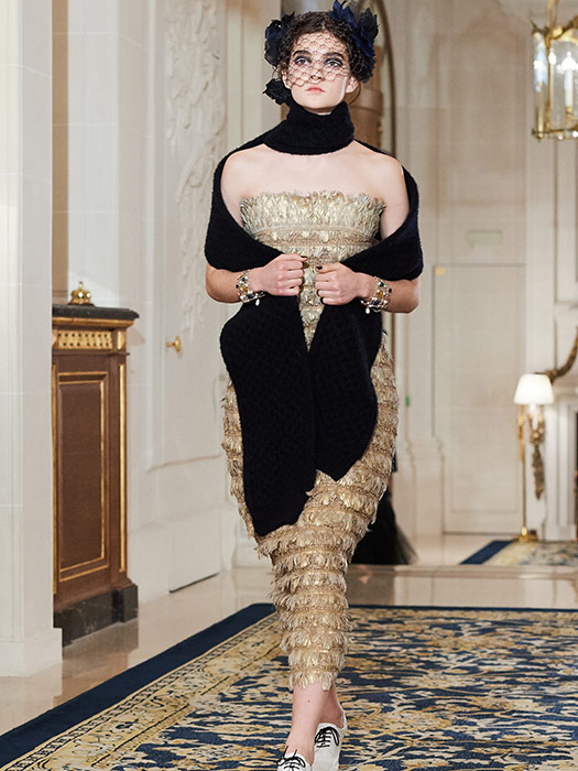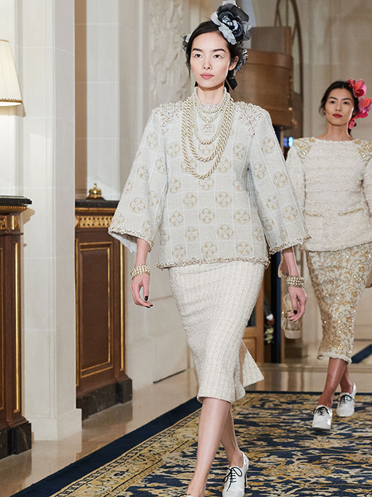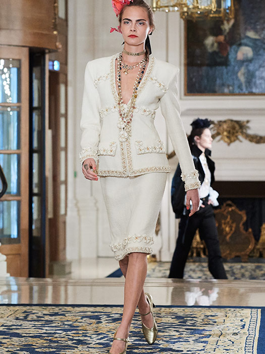 Very elegant and inspired by “the evening dresses that women used to wear to dine at the Ritz” according to Karl Lagerfeld, this incredibly Parisian collection focuses on a silhouette with a welldefined waist and lengthy godets that caress the calf. Cream, white, navy blue and black along with flashes of red and scintillating golden hues dominate the palette. Embroideries worked to the max, sophisticated sunray pleats, marabou and ostrich feathers reflect the skills of the petites mains who work in the CHANEL Métiers d’art ateliers. The collection delivers new ultra-feminine versions of the iconic CHANEL jacket, adorned with braids made from pearls or tweed roses, floral embroidery and Plexiglas buttons. The shoulders that open like butterfly wings are finished with epaulettes embroidered with jewelled crystals. Split with two fringed pockets, the jacket adopts an officer’s collar and white trompe l’oeil cuffs and is worn with a wrap-around skirt cut below the knee. Elsewhere the jacket features leather details like a triple belt around the waist. More than ever the suit expresses a new sense of modernity: its straight-cut skirt alternates with Capri pants; its jacket becomes a spencer worn with a tunic or a bolero over a long dress. It even comes as a double-breasted tuxedo with wide-cut tweed trousers and satin trim. Ample and comfortable coats with bias-cut panels boast large warming collars and maxi-cuffs in tweed, while others opt for quilted or floral and pearl embroidered denim. Short flowing capes in tweed, felt, embroidered denim and even marabou rub shoulders with quilted down versions. Diaphanous skirts in tulle and sunray pleated Lurex skim the ankle. The collection also shines a spotlight on knitwear: a sweater with richly embroidered epaulettes, a backless jacket with embroidery intertwined with cashmere, a jersey with puffed sleeves and knitted embroidery…