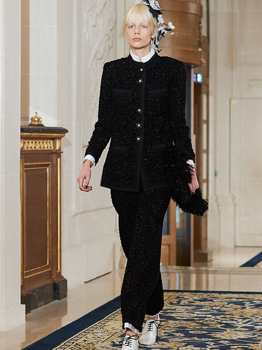 In this cosmopolitan Ritz Paris, day meets night with perfect indifference, and vice versa. The trouser suit in chenille velour tweed with a grosgrain braid nonchalantly glides past a dress and cape in marabou with tulle and chiffon petals. The gold sequinned tuxedo is just as at home here as the navy