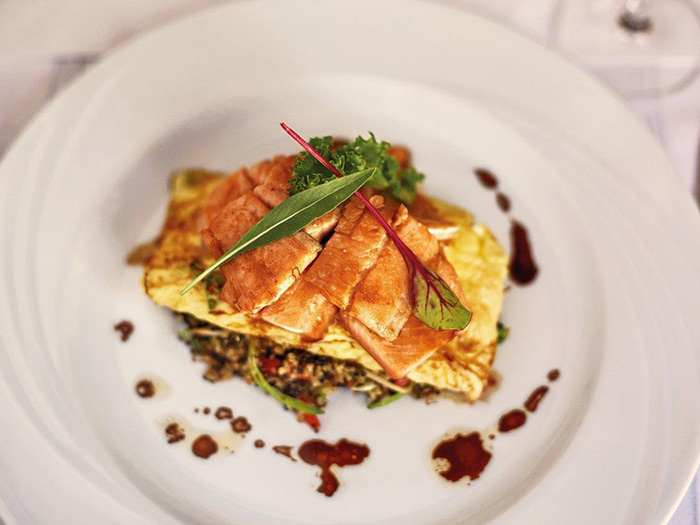 - Preparation: in a frying pan, brown the chives and onions with the butter; add the salmon and cook, then add the white wine. Meanwhile, rinse the quinoa, boil some water in a saucepan and place the quinoa. Once cooked, add over the court bouillon gently, and let simmer for a few minutes, stirring. Wait until the liquid is absorbed. Continue adding the stock broth in small amounts as it is absorbed. Pour the quinoa into hollow plates and top with trout and parmesan.