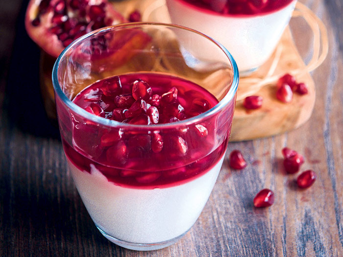 - Preparation: Boil the cream and 4 spoons of rose syrup with 1g of gelling previously dissolved in some water, for 4 minutes. Add the sugar. Pour the cream into 4 glasses, let them cool. Then place the glasses in the refrigerator for about 2 hours for the mixture to be well. Boil 0.3l of water with 4 tablespoons of rose syrup and 2g of gelling for 3 minutes. Remove from heat and add grains of pomegranates. Let it cool. Then add them to the panna cotta and place for about 2 hours in the fridge.