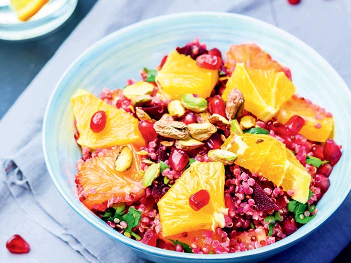 - Preparation: Boil the quinoa grains in 800g of water for about 8 minutes. Remove, drain and let it cool. Season with oil and molasses and add coriander. Decorate with pistachios and pomegranates then place the pineapple slices.