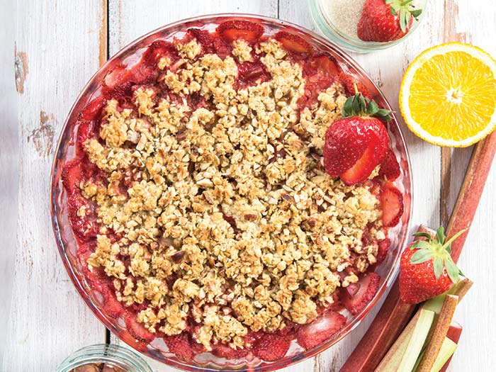 -Preparation: butter a baking dish. Cut the rhubarb into sections 1 to 2cm long. Cut the strawberries in 2 if they're large. Place the rhubarb and strawberries in the dish, and sprinkle with small pieces of candied orange peel. Mix the butter, flour and sugar and crumble them by hand over the strawberries and rhubarb in a consistent layer. Bake in medium oven for 30 to 45 minutes until top is golden brown. Serve hot with whipped liquid vanilla ice cream.
