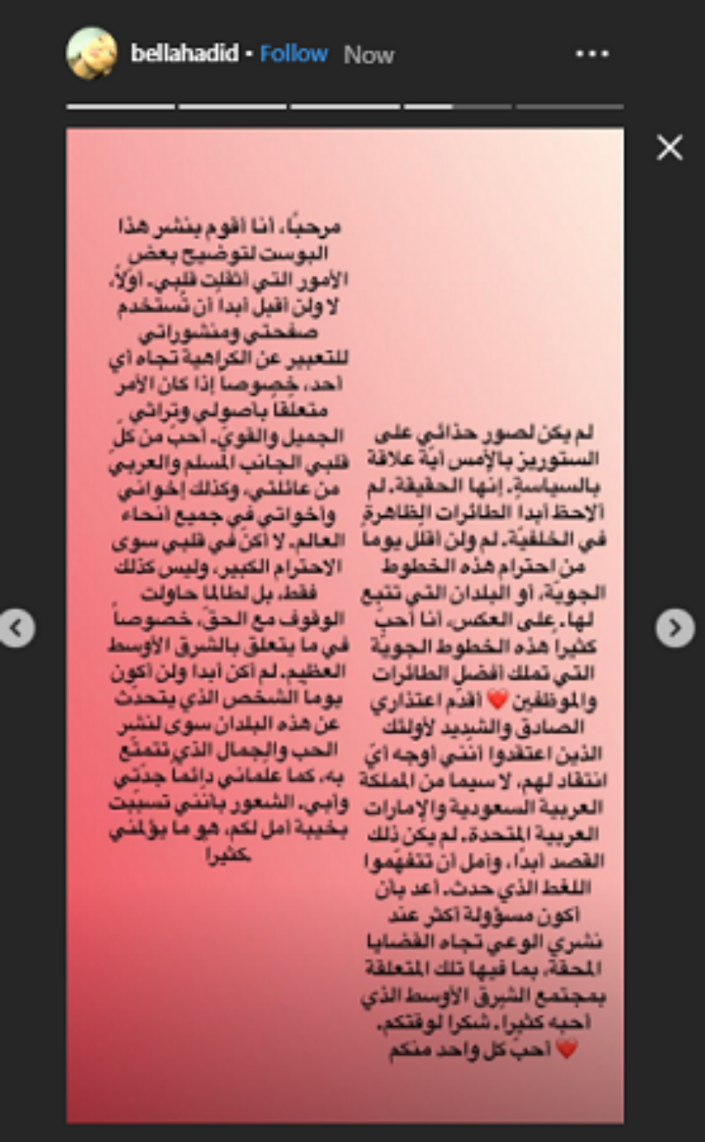 Bella Hadid has apologized to her followers in the Middle East, via a story on her Instagram account. In the details, the 22-year-old supermodel apologized for the controversial photo she posted a few days ago, which shows her shoe up against an airport window, while fans could clearly spot airplanes from Saudi Arabia and the United Arab Emirates in the background. In her apology message, Bella wrote in both English and Arabic “I am posting this to clear up a few things that have been weighing on my heart. To begin, I would never want my posts or platform to be used for hate against anyone, especially those of my own beautiful & powerful heritage. I love and care so much about the Muslim and Arab side of my family, as well as my brothers and sisters throughout the world. Not only do I have so much respect from the bottom of my heart, I have always tried to stand up for what I feel is right, especially regarding the great Middle East. I have never and will never be the one to talk down on these countries… Only to spread love, and the true beauty of them, as the way I was taught by my Teta and my father. To feel as if I have disappointed you is what hurts me the most. The photo of my shoe on my Story yesterday had NOTHING to do with politics. I promise. I never noticed the planes in the background and that is the truth. I would never mean to disrespect these airlines, let alone these amazing countries. I absolutely love these airlines, with the best planes and people. I want to send a sincere apology to those who ever thought I would put blame on them, especially to Saudi Arabia and the UAE. This was never the case, and I hope you can understand the misunderstanding. I will be more responsible when bringing awareness to all causes, including my beloved Middle Eastern community. Thank you for taking the time. I love every single one of you.”