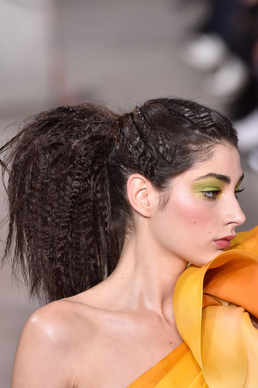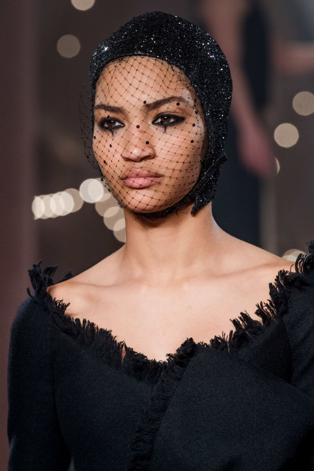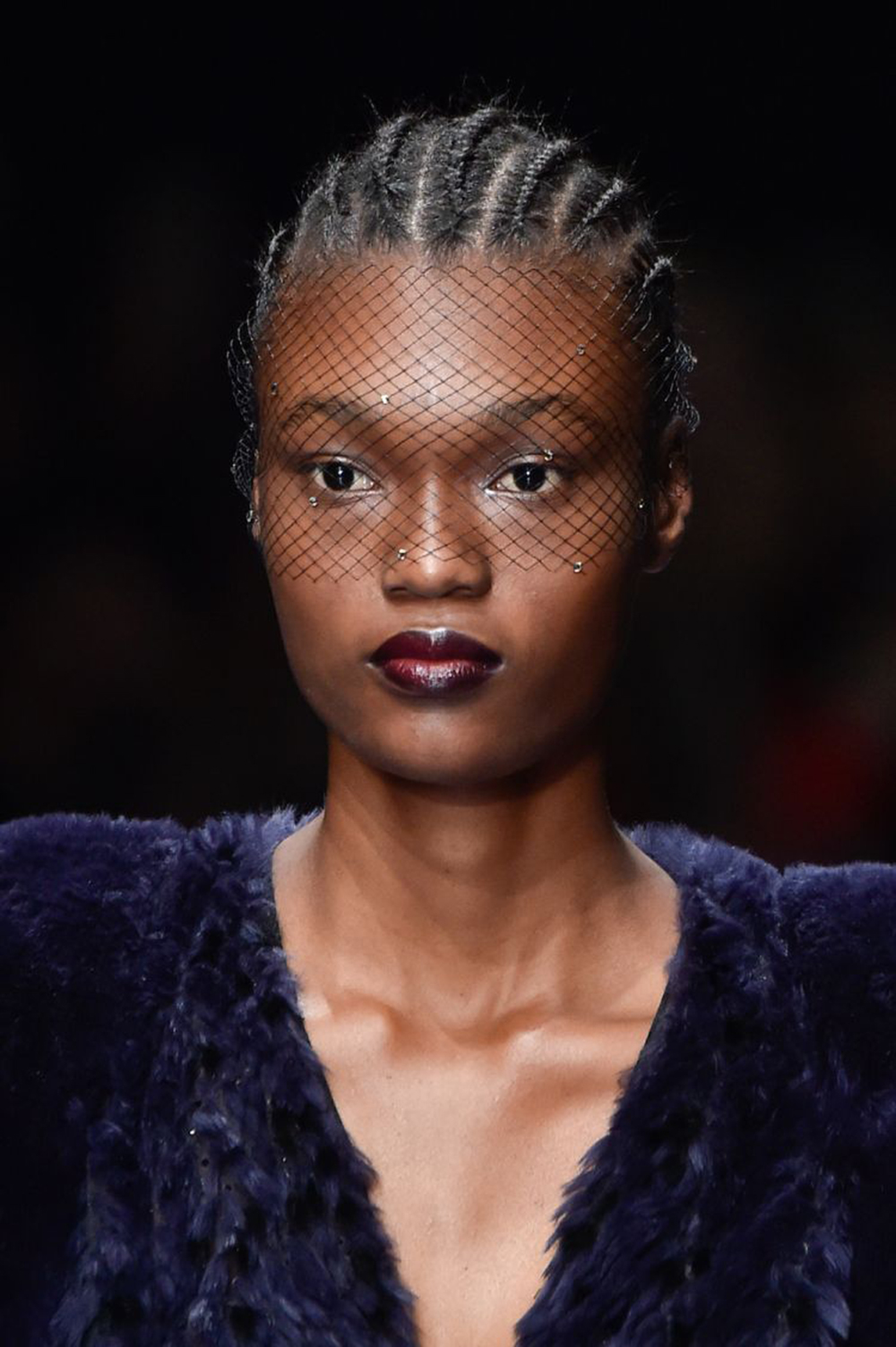 Bold and fierce, the burgundy lipstick made a statement during the Azzaro runway. The look, glossy and natural, was accessorized by a veil that brings balance between the lips and the soft eyes.