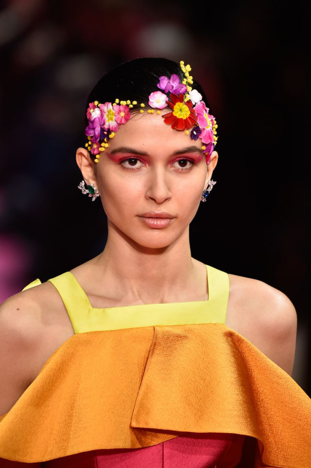 working with real blooming flowers, hairstylist Beppe D'Elia created models for the head accessories with a crown of shading. Sensitive yet energetic, the look was done with a scope on neon pink over the eyelids by cosmetics icon Lloyd Simmonds.