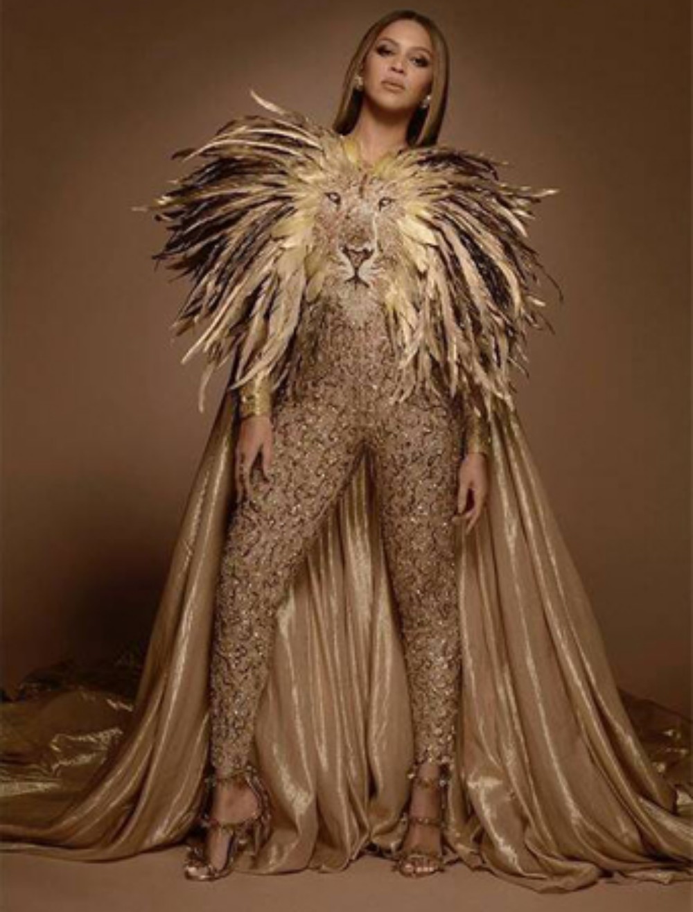 At the event, The American singer embodied a Lioness in her custom gold-sequined printed jumpsuit with a lion-face embellished bodice.