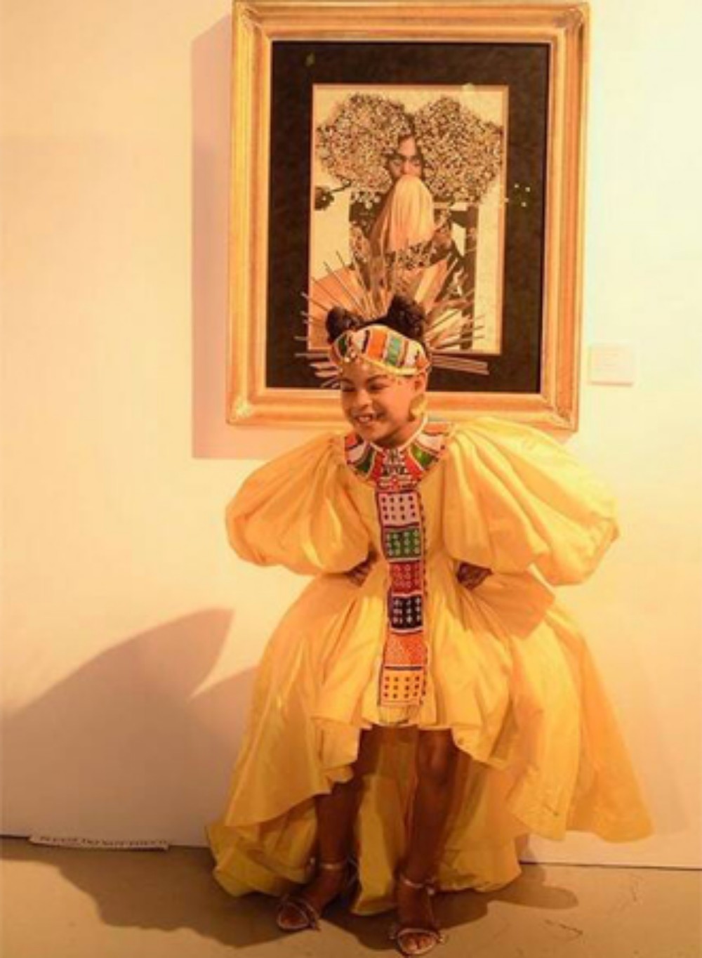 Blue Ivy wore an asymmetrical yellow dress with a beaded headband. Beyoncé published several photos of her and her child, as well as a video of Blue Ivy singing "Circle of Life".
