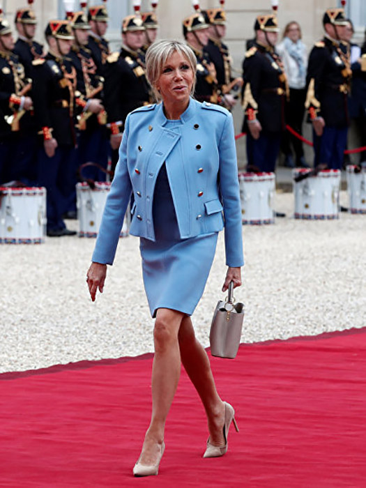 How can we not mention her marvelous powder blue power suit by Louis Vuitton? Brigitte chose this look for her first appearance as first lady. Sure, some may say that she copied Melania Trump or Jackie Kennedy, but we can’t ignore the fact that she looks gorgeous in it.