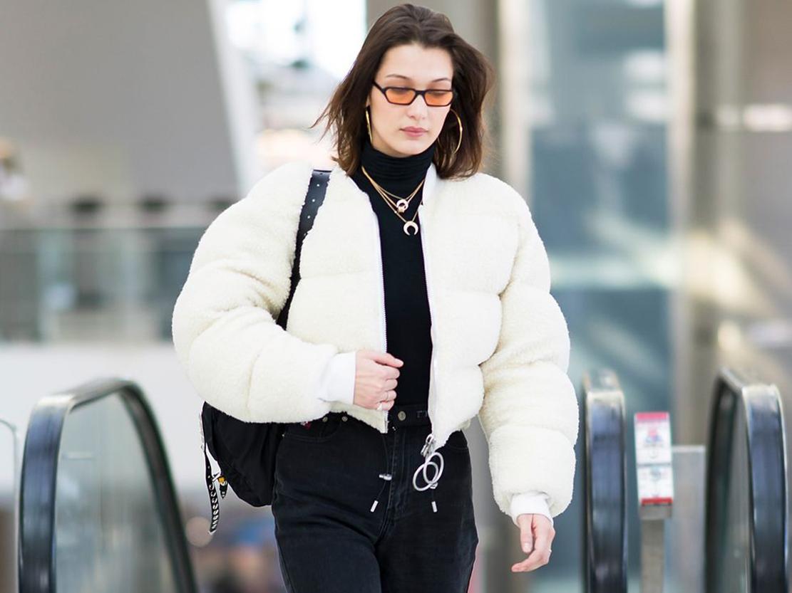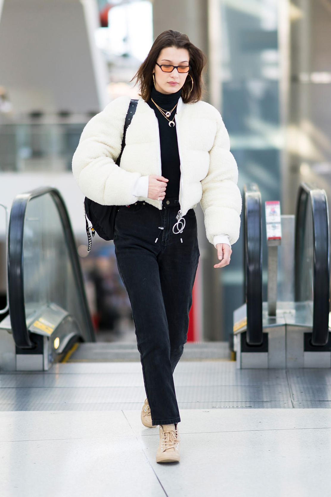Puffer coat, turtle neck, and a comfy pair of jeans. What else do you need for a relaxing flight? Bella Hadid went casual to the airport and added a double necklace and hoop earrings for a trendy style. Tuck your cozy turtleneck under your high waisted jeans and make sure you have a nice book to read in that backpack.