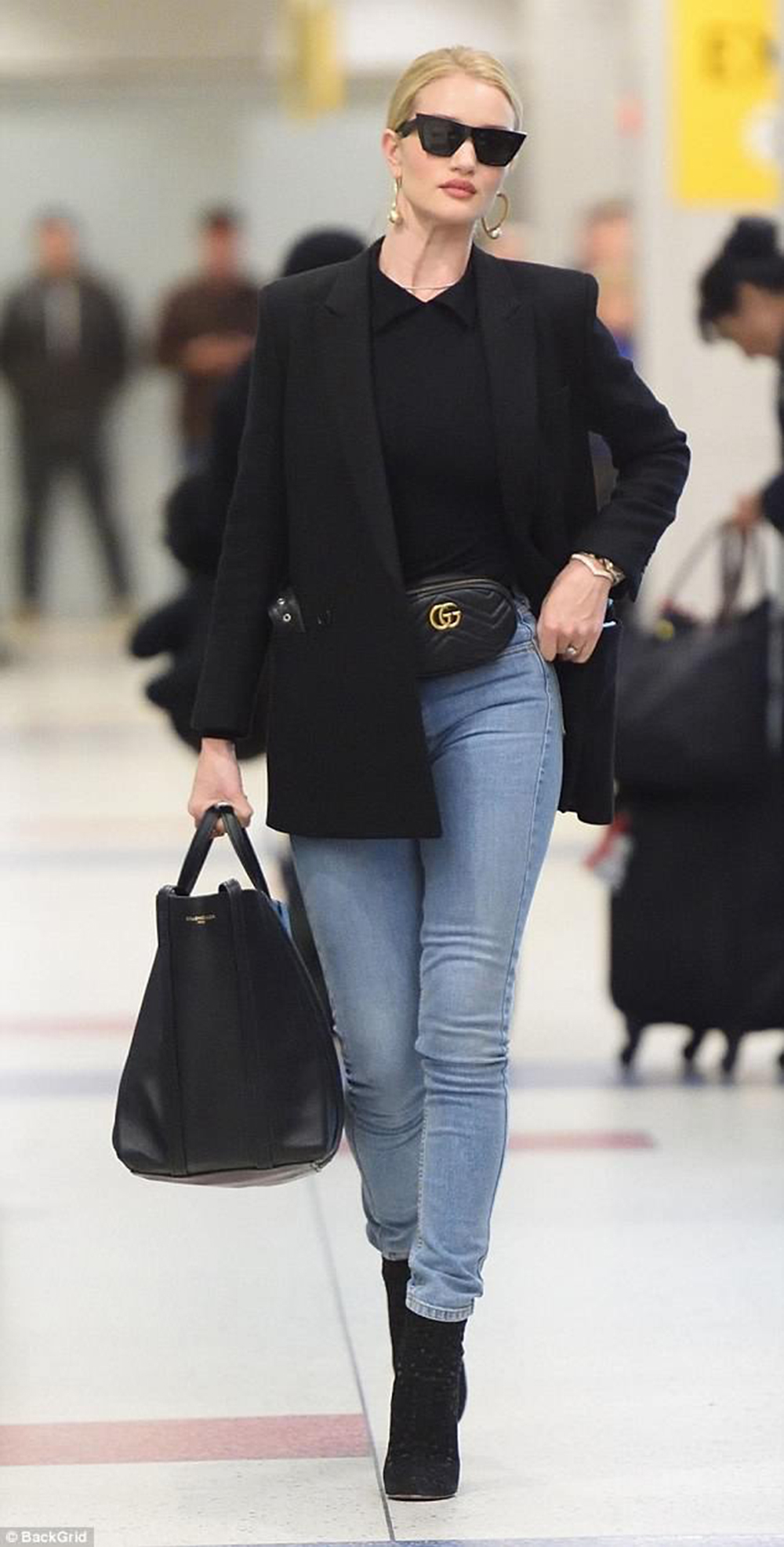 Rosie always has that feminine empowered attitude. A classy Airport style? A pair of jeans, and an all-black outfit. Match the pants with nice dark shoes, t-shirt and fancy blazer. To stay on top of the fashion trends, make sure you wear a bag belt and square sunglasses and you’re good to go.
