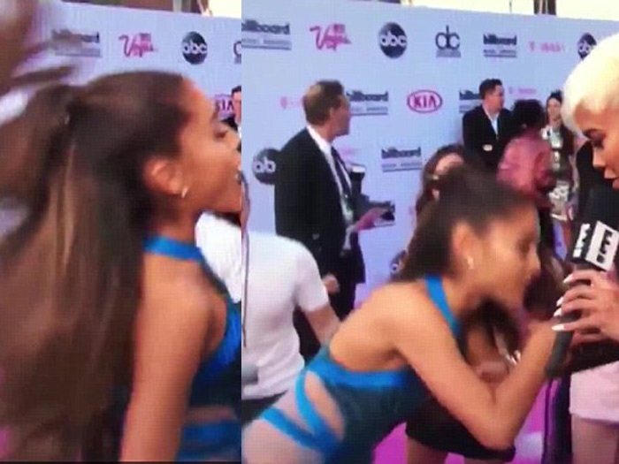 During a live interview on the Billboard Awards red carpet, Ariana Grande tripped and almost fell. Thankfully, she grabbed the spokeswoman beside her (and almost made her fall too).