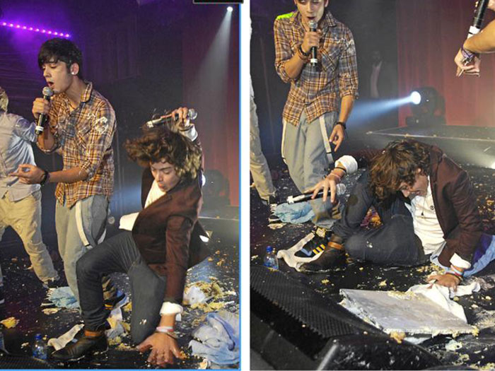 Playing with food has its consequences… Harry Styles along with his One Direction band mates were performing at G-A-Y nightclub where a lively food fight took place. Harry slipped on a piece of cake, and everyone started pointing and laughing! We feel bad for him though.