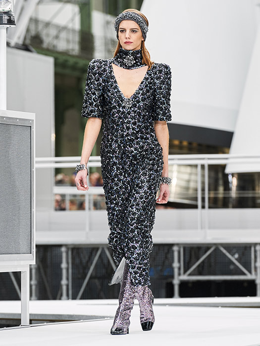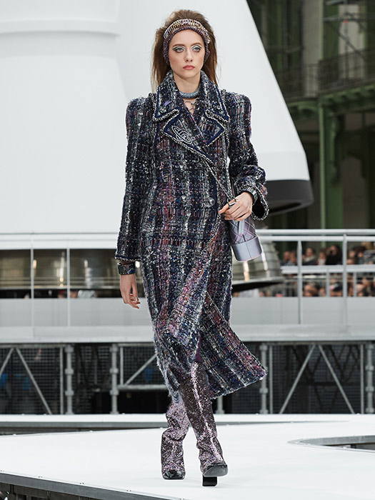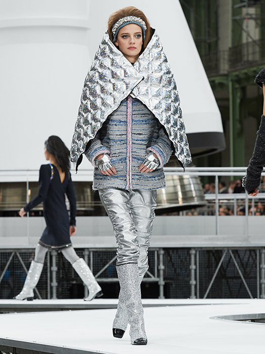 This season, Karl Lagerfeld projects CHANEL into space. In the Centre de lancement N°5 décor in the heart of the Grand Palais and at the foot of an immense 37 meter-high rocket, 90 models reach for the stars wearing boots scintillating like diamond constellations and headbands embroidered with crystals or faux pearls. “It’s a journey through the sky, to the heart of constellations, in the wake of the astronaut Thomas Pesquet,” explains the designer.