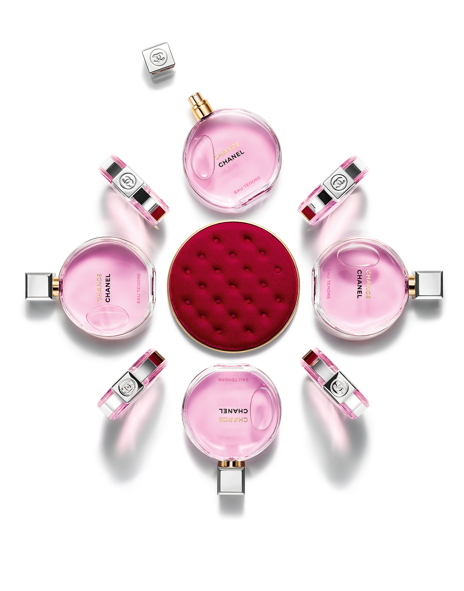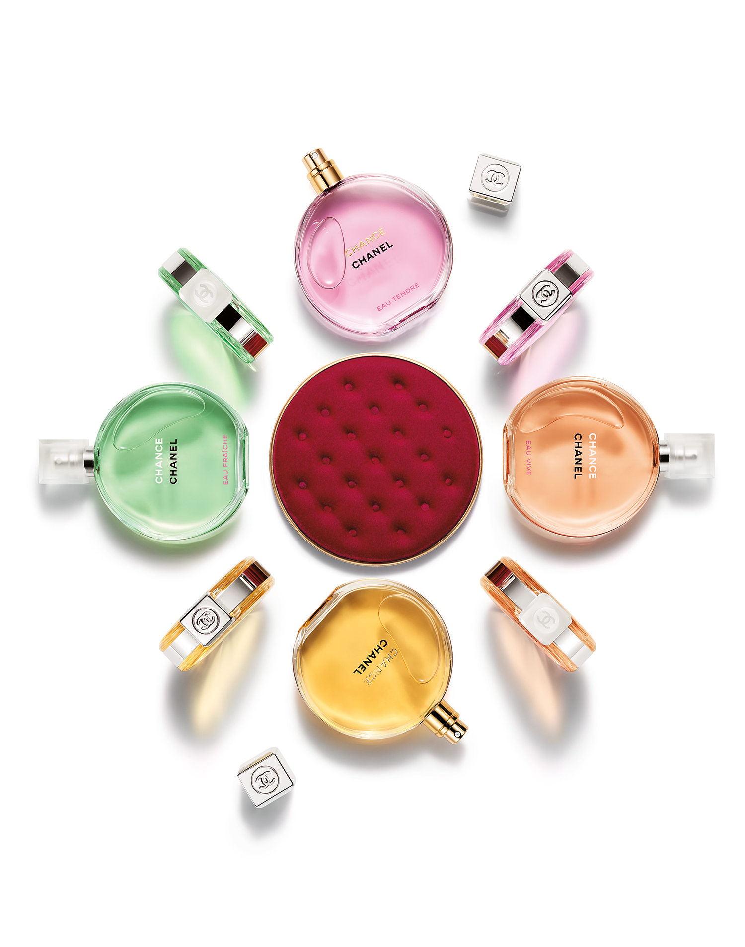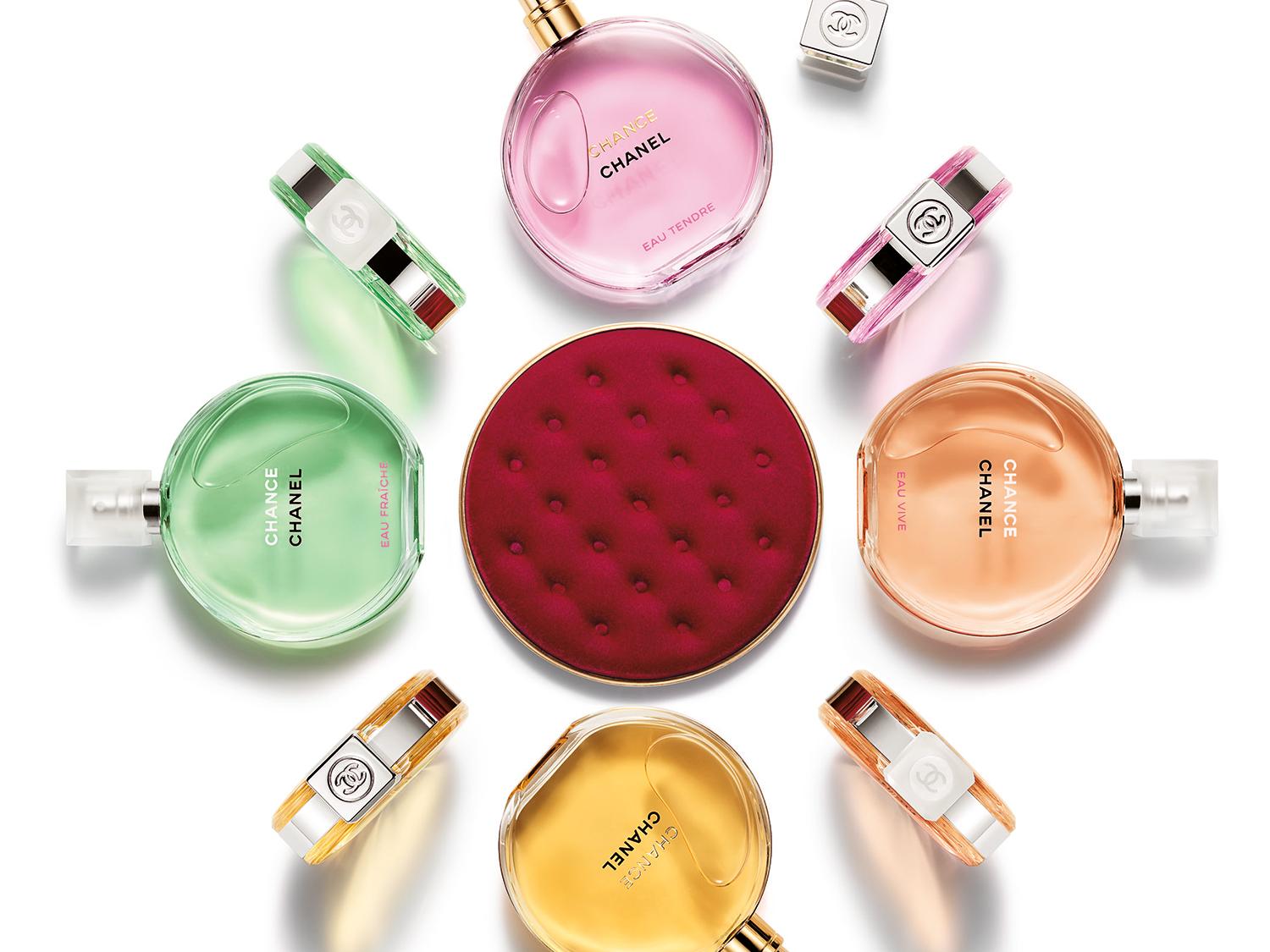 CHANCE, the original fragrance with a heart of jasmine, orchestrates the surprising contrast between a fresh burst of pink pepper and citrus and the richness of a woody, chypre base with patchouli. Joyful and sparkling, CHANCE EAU FRAÎCHE enhances the zesty accents of citron to brighten its jasmine heart, before gradually unfurling the elegance of a vibrant woody note on the skin. Ever so softly, CHANCE EAU TENDRE nestles its jasmine heart in a cloud of creamy, musky notes with the tang of a delicately fruity accord of grapefruit and quince. CHANCE EAU VIVE cascades onto the skin like a burst of energy. The surprising bitterness of a grapefruit and blood orange accord introduces the cedar-iris accord that upholds the heart of jasmine.
