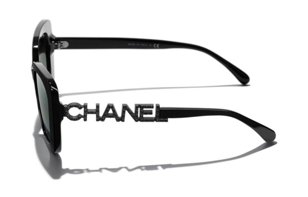 A recurring theme throughout the collection, the strass illuminates the CHANEL signature. On the very feminine square frames in black, navy blue, dark green and tortoiseshell acetate, the name CHANEL appears along one temple like a jeweled hair-slide. On the other temple, double C is also inlaid.