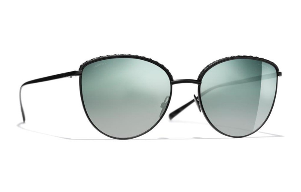 Finally, an oval frame in gold metal or matte black encircles grey or mirrored lenses with shifting reflections. The strass responds to the colors of the frames and follows the lines of the eyebrows.
