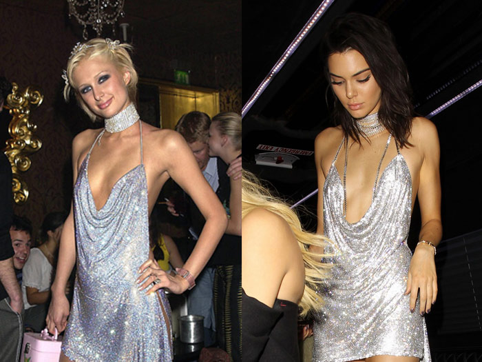 Kendall Jenner celebrated her 21st birthday this week, and for the occasion, she wore a sparkly silver party dress designed by Antoine Salameh… and this dress looks almost identical to the dress Paris Hilton wore for her 21st birthday in 2002!