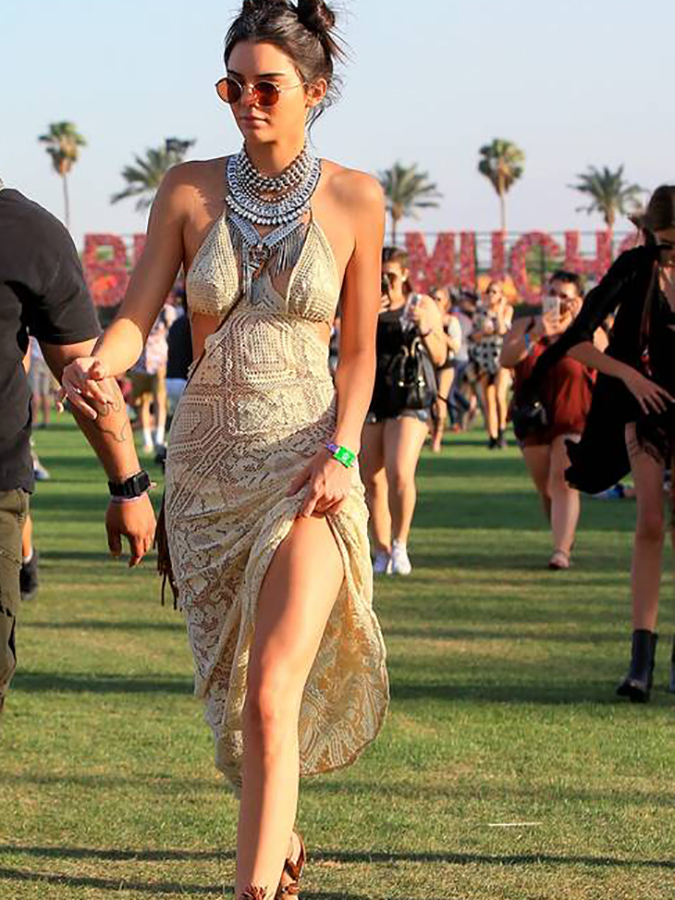 The sexy Calvin Klein model selected a very unique cut-out cream lace dress for the festival. She paired her dress with cool Aquazzura flat sandals. And let’s not forget accessories; the 20 year old beauty ornamented her dress with a huge necklace!