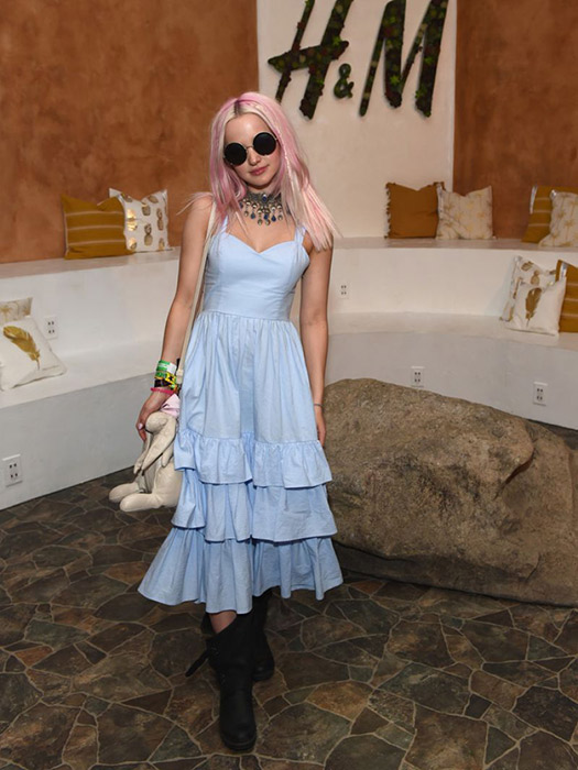 The Liv and Mattie star was in an ultra-cute bright blue maxi dress. She got bored of her blonde locks, so she decided to make a drastic change for Coachella. Dove went for bright pink hair, and it looks absolutely fabulous!