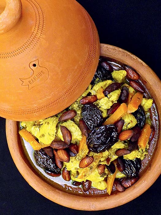 -Preparation: Soak the prunes in tea for 4 to 5 hours. Chop the onions. Heat the oil in a casserole and brown the pieces of chicken. Season with chilli and cinnamon. Drain the chicken and set aside. Place the onions in the pan and let them melt on low heat for 15 minutes. Add salt and pepper. Heat the oven to a thermostat 5. Drain and pit the prunes. Add the almond powder to the casserole and mix gently. In a baking dish, place the chicken and prunes on the onion and almond mixture. Pour half a glass of water, cover and cook for about 60 minutes. Serve hot and decorate with almonds.