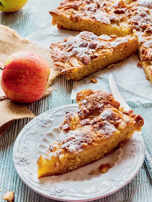 -Preparation: Preheat oven to 210°C. Garnish a tart pan with the puff pastry. Cut the apples into thin slices and arrange them on the dough. Bake for about 20 minutes. In a saucepan, melt the butter over low heat. Add honey, sugar and almonds.