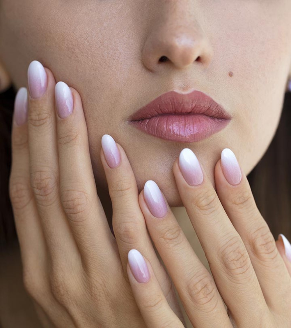 No half measures this season. We play with opposites and we dare different colors. Apply black and/or white. Marian Newman also advises betting on dark purple and lilac, nude and navy blue ... Elegant contrasts that change (finally) from classic red. Is the fall-winter nail polish matt or shiny? Glitter is always in fashion but not on the whole nail or not on all the nails. The comeback? Ombré nail, in French "degraded manicure". A trend confirmed by Dua Lipa. The 24-year-old singer wore a blue and pink shaded manicure during the second edition of the Sunny Hill music festival in her parents' country of Kosovo.