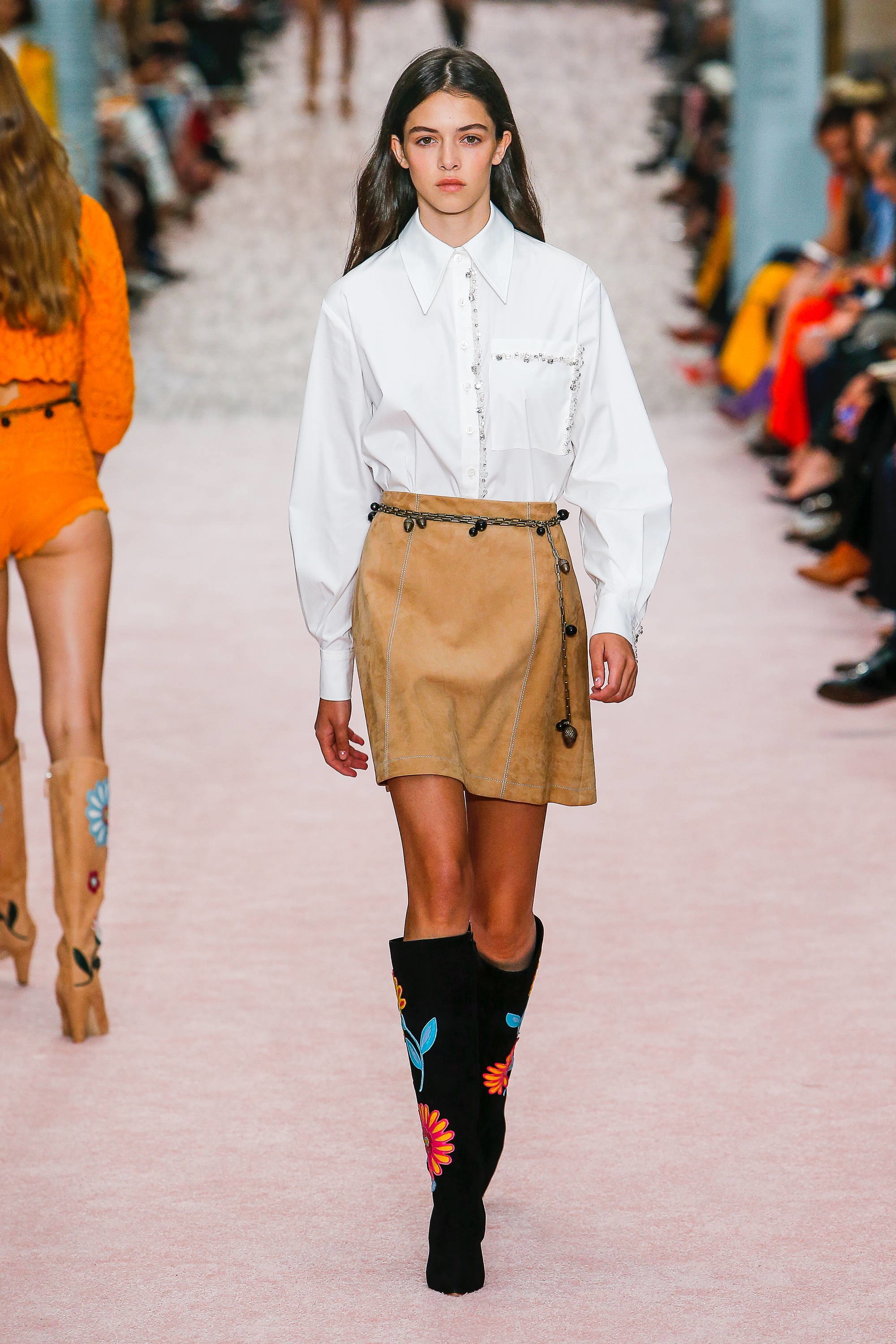 If your formal meeting can handle a dose of playfulness, go for a Carolina Herrera stylish outfit. The white t-shirt with sparkles on it will do the job with its wide collar and big pocket. The skirt adds a formal attire and the belt are so trending this season, but what we love the most about this look is the knee black boots lighten up by flowers.