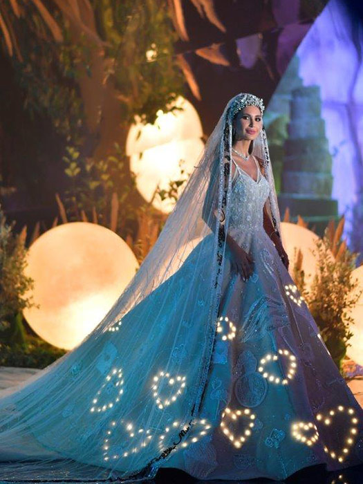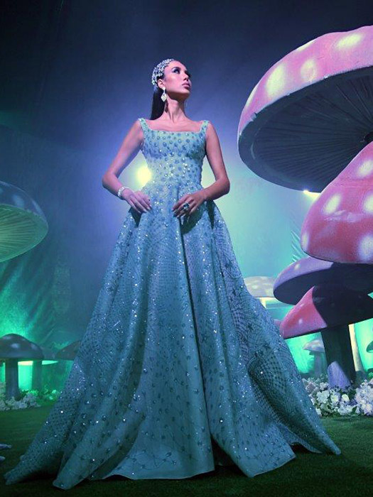The bridal dress took over 1200 hours of craftmanship, hand embroidery and delicate detailing. It included Swarovski crystals, beads, threads raffia and light threads with a touch of multicolored beads- the dress was made by the genius Rami Kadi.