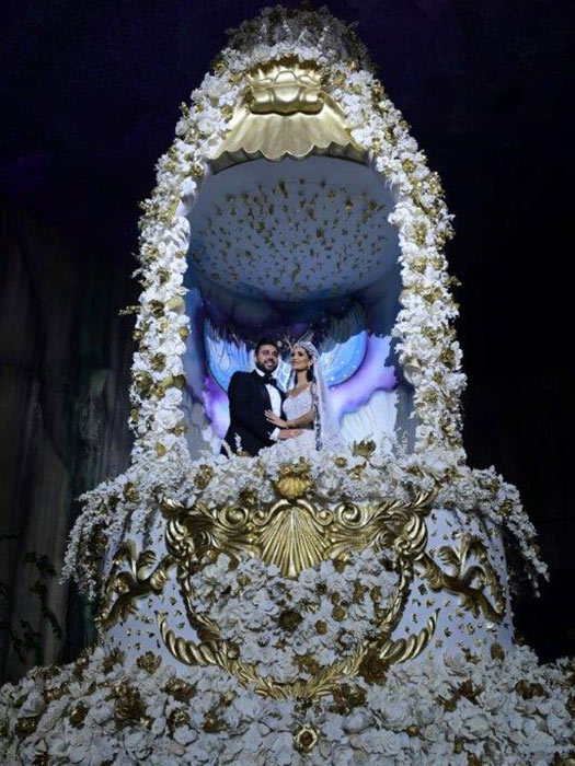 The wedding cake weighed over a ton and had over 7000 hand-made flowers carved all around- the couple were levitated from the inside to create the iconic statue of every wedding protocol- (catering Le43)