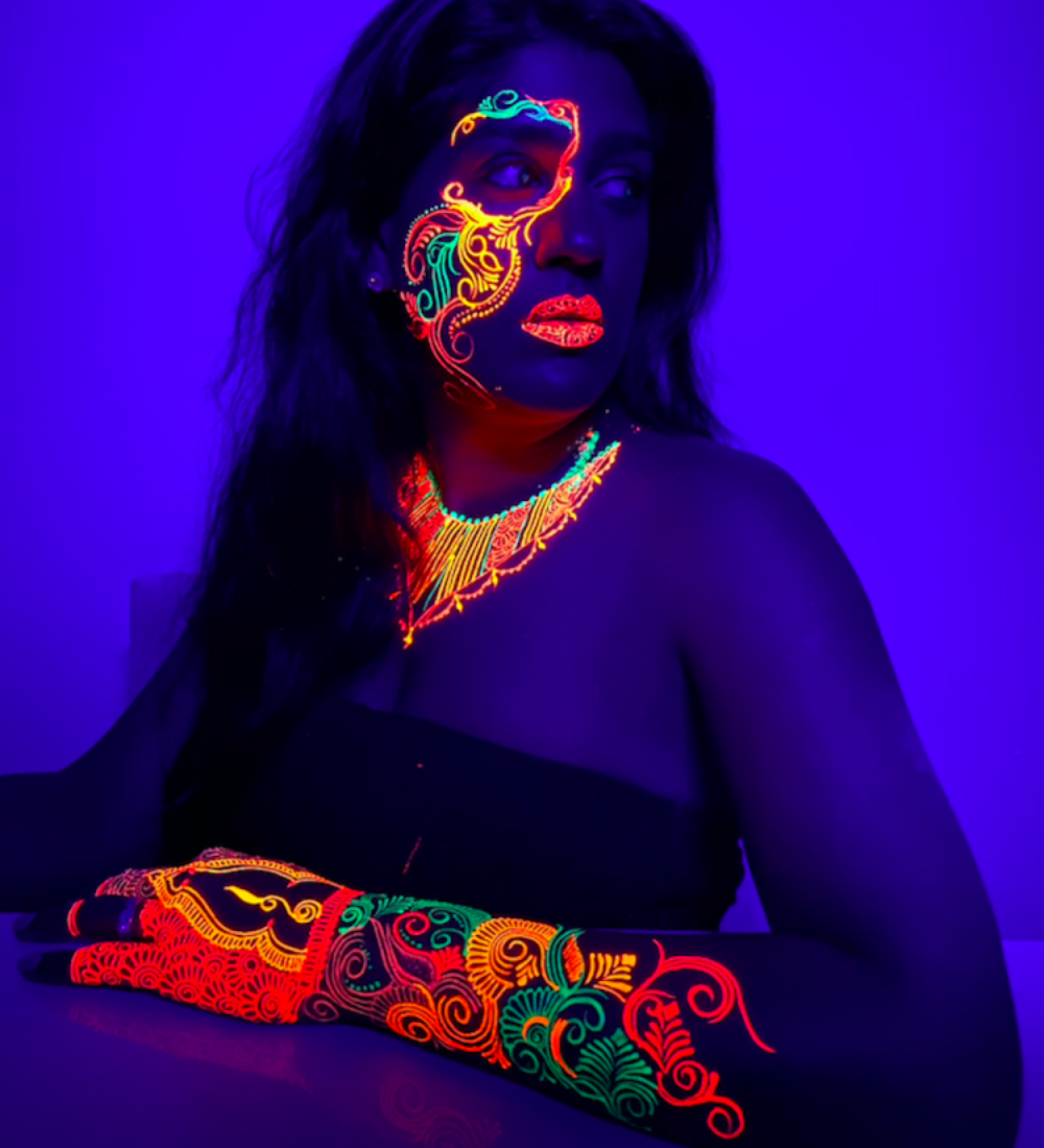 This time of the year calls for the dark henna which glows in lightening those autumn nights. Pavan Dangal designed this unique and much-needed henna that can make you stand out from the crowd, especially when the lights are off. When you reach the neon orange, pink and green, the possibilities of designs and patterns are endless. The henna lasts 24 hours, can be easily washed. It was mainly launched on Halloween, but it is perfect for parties and special occasions.