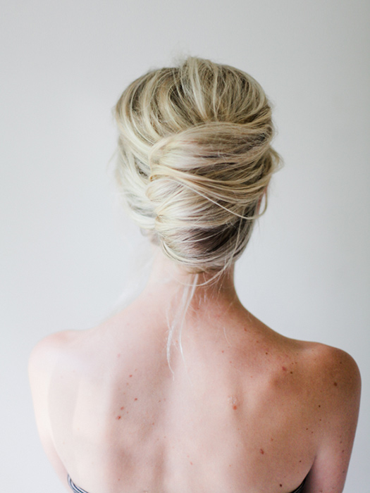 It’s just like the classic French bun, but we’ve taken a slightly messy take to make it more modern. Just sweep your hair to one side and put a bobby pin vertically. Then, slip in a row of bobby pins vertically, from the bottom up. Push in the last one downward. Twist your hair and pull it up, then insert bobby pins horizontally into the base of the twist. And finally, spray, spray, spray!