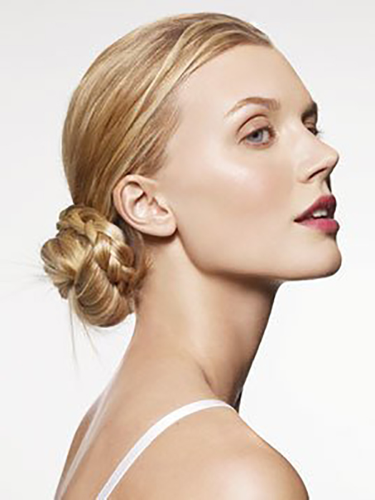 Here’s how you get the look: pull your hair into a low side ponytail just behind your ear; and secure it with elastic. Separate out a small section and braid it, then put the rest of the ponytail around its base. Pin to secure, then wrap the braid around the bun.