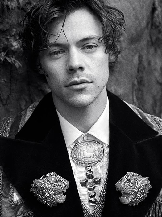 Former One Direction member appeared today in new campaign for Gucci modeling a variety of jackets, blouses and trousers paired with a daring gold headpiece. Who else could pull off a perfectly feminine look with such a manly attitude?