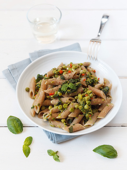 Pour rigatoni in a bowl, add spinach, lemon zest, peas, salt and pepper and serve immediately.