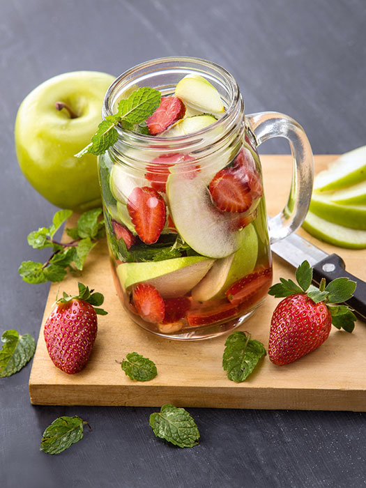 Cut the apple into quarters. Remove the stalks from the strawberries and cut them in half. Put the fruit and mint leaves in water and infuse without adding sugar, for an hour at least. For optimal taste, leave overnight in the fridge.