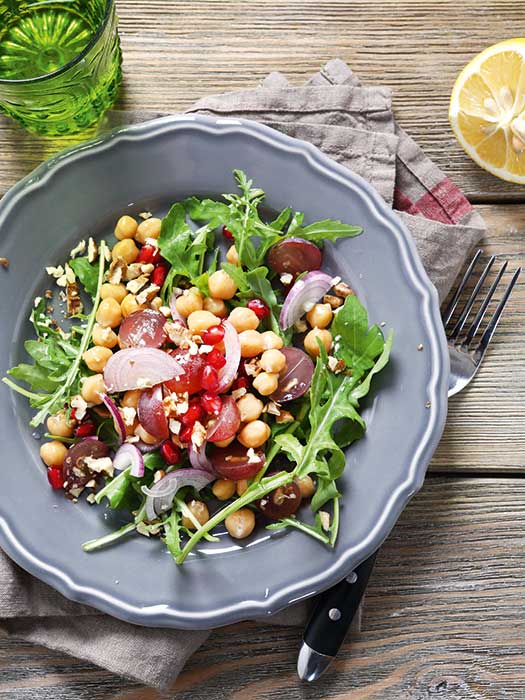 Mix olive oil, lemon juice, a pinch of salt and pepper, and pour them over the salad. Garnish with crumbled walnuts and serve immediately.