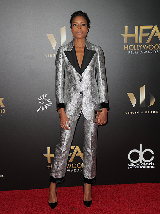 Naomie Harris was honored for her lead role in the movie Moonlight. She was in a gorgeous boyish silver pantsuit for the red carpet.