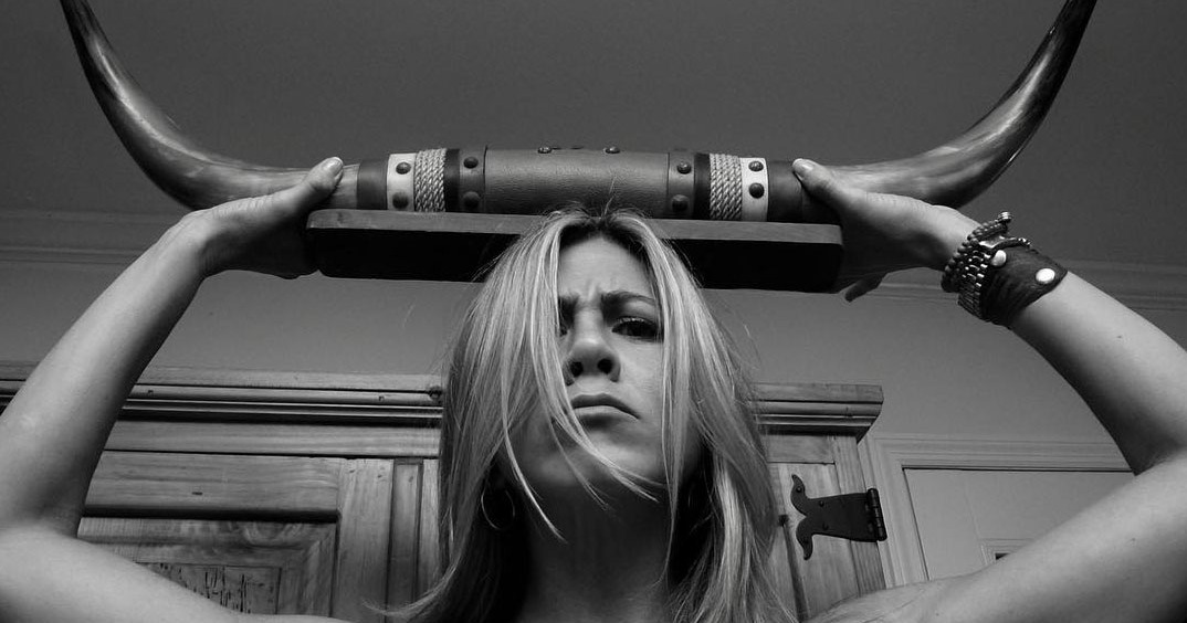 In the photograph, Jen holds a couple of bull horns over her head flaunting her perfect arms, matching his perfect caption.