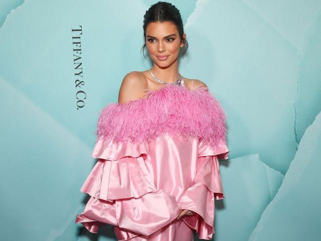 Kendall Jenner is today in Sydney as she attended the opening for Tiffany & Co.'s flagship store in the Australian city. Jenner dressed in one of her wildest dresses this year: a short, oversized bubble gum pink number with tiered sleeves and a feathered neckline by Ingie Paris. She paired it with a silver necklace—with what appears to be a pink butterfly pendant—and white heels. It's a lot of look to take in.