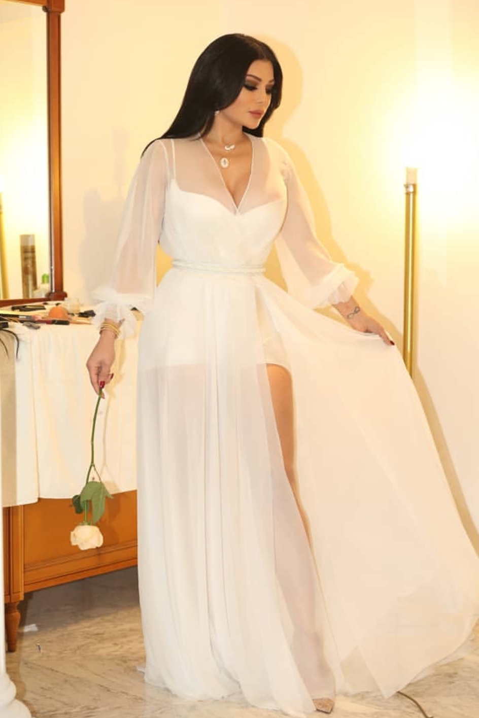 The Arab star wore a Nicolas Jebran classy white dress for her New Year’s concert in Golden Tulip Carthage, Tunis. Haifa matched the veiled white dress with simple bracelets and necklaces along red nail polish to contrast colors. Her make up and smooth hairstyle perfectly complemented her royal chic look.