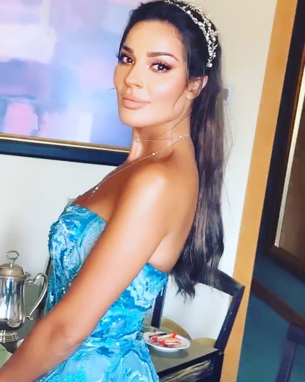 Lebanese actress Nadine Nassib Njeim looked dazzling in a light blue gown designed by Zuhair Murad as she was a bridesmaid at the wedding of her friend Nathalie Nasrallah, who won the Miss Lebanon Emigrant title in 2004. Her stylist, Jony Matta, paired the Zuhair Murad gown with an Aura Headpiece, and jewelry by Bulgari and Yessayan.