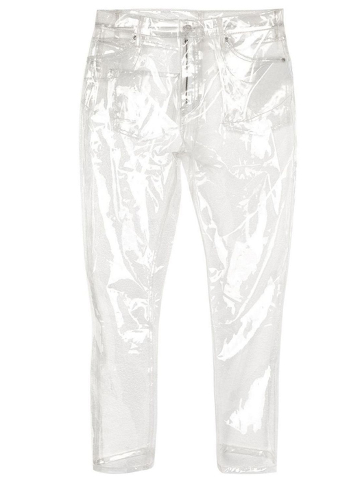 Topshop is selling clear plastic jeans, and they look a lot like transparent body bags. And what about the sweat? Is it a part of the so-called trend or did they just not consider it?
