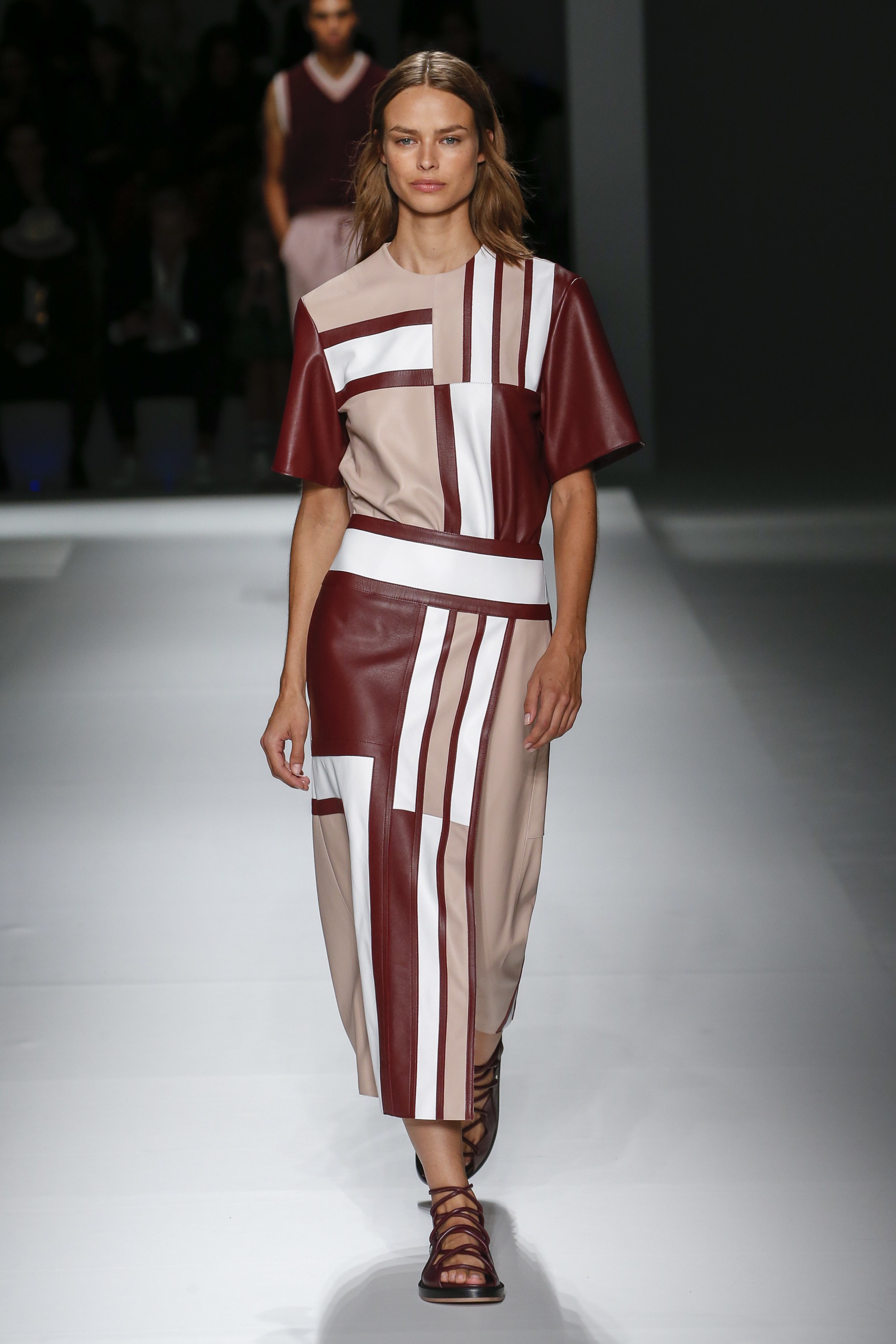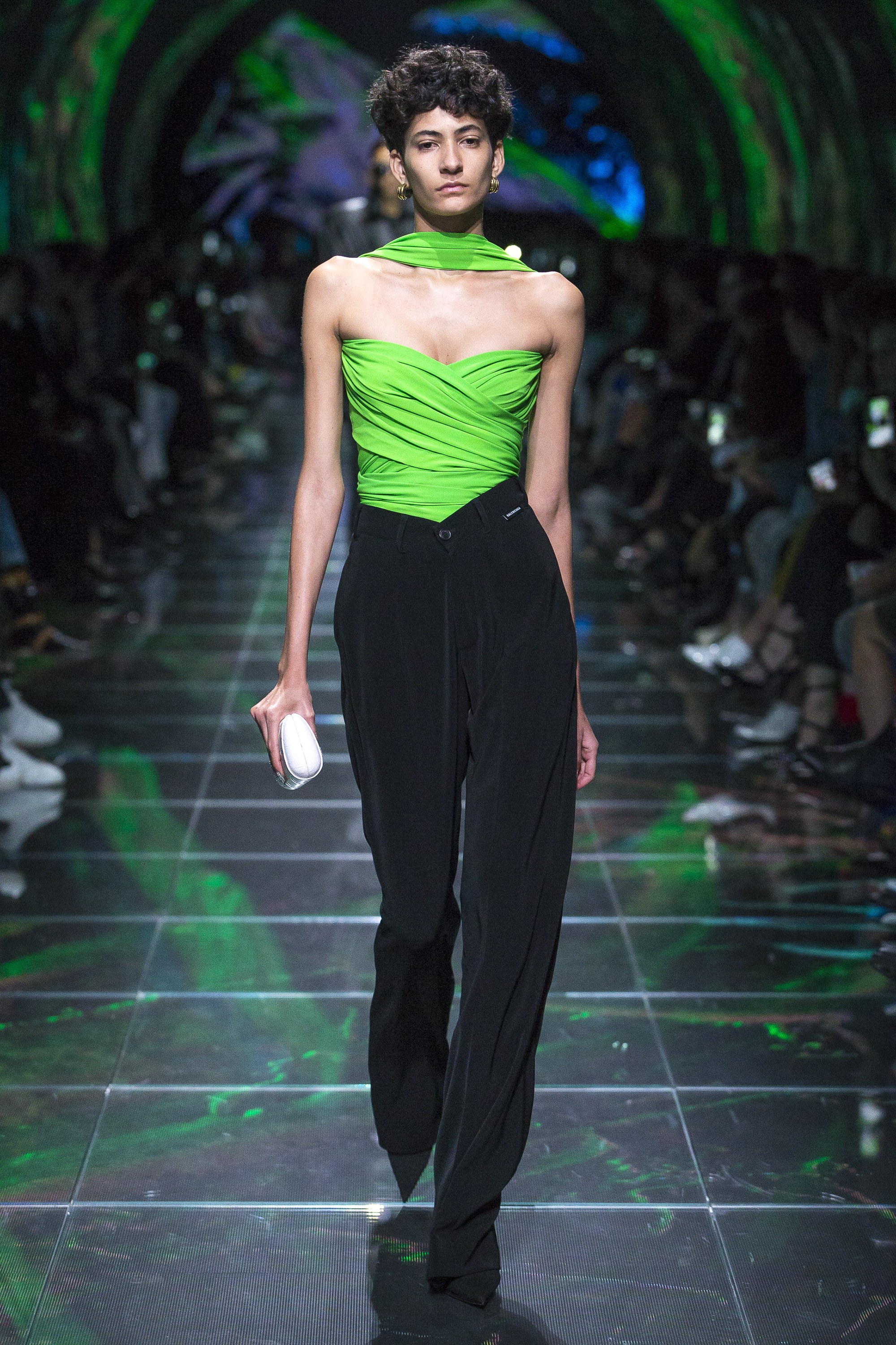 The Balenciaga Spring 2019 collection gave us a show to remember. Starting from the classy sophisticated look, the contrast between the green and the black is sure to make you noticed. There is a balance between the strapless dress and the neck scarf attached to it. The house of fashion added a bit to white to the purse, held with sparkly nails.