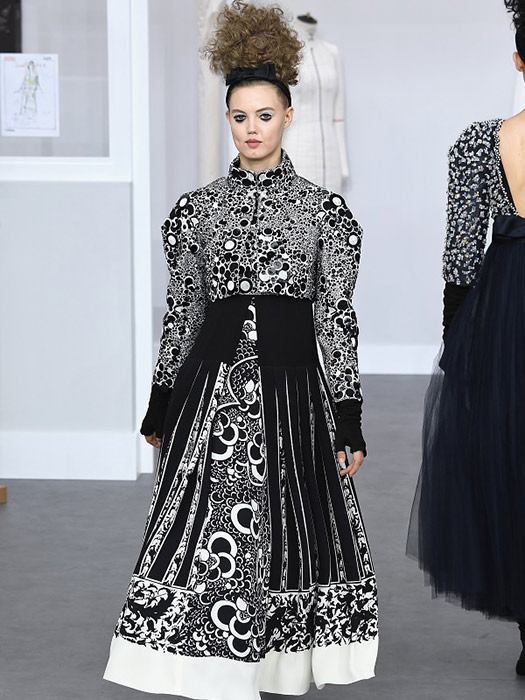 Dior presented their models wearing sported flat sandals, full skirts, narrow-waist blazers and most of his designs were in black and white excess embroidery and tulle.