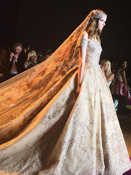Zuhair Murad makes us wish we could get married in his Haute Couture gowns. We can distinguish his signature in the sheer gowns, and the Lebanese designer was careful to add exquisite details on the wedding veil and gown.