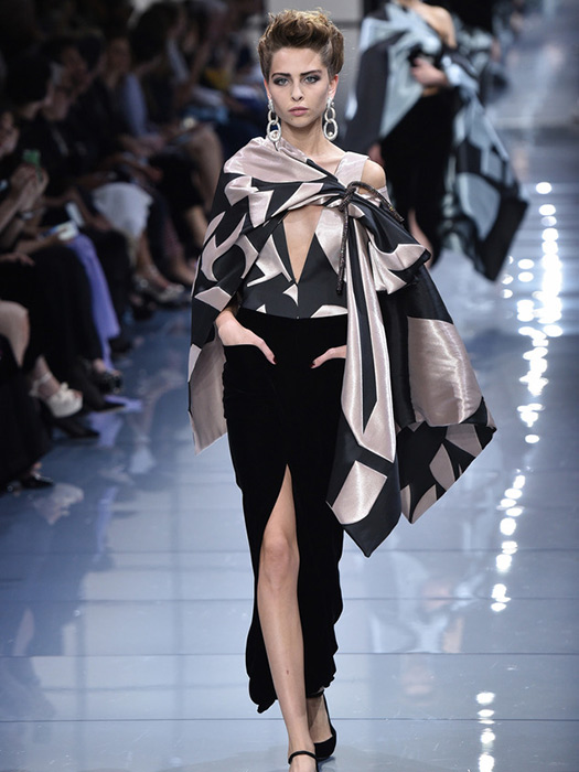 Giorgio Armani’s Armani Privé collection was far from being a disappointment. Satin trousers and collarless peaked-shoulder jackets and sleek velvet gowns were featured in his marvelous collection.