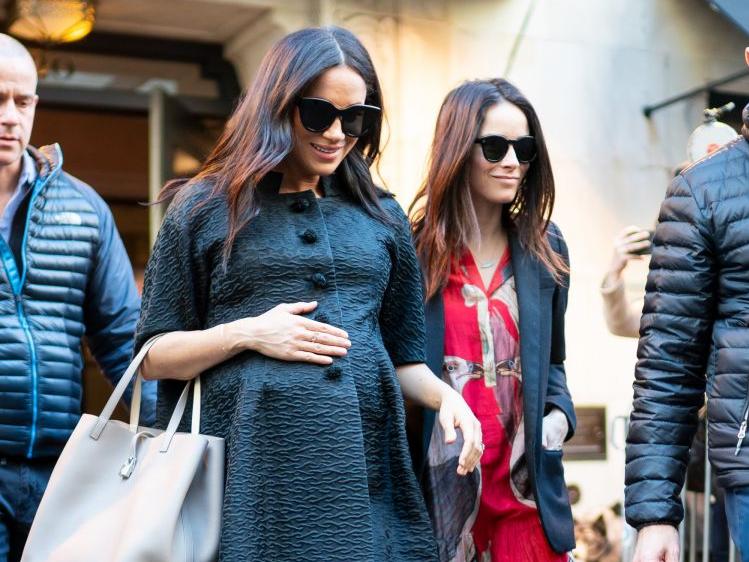 Following the baby shower, the Duchess of Sussex stepped out for a dinner at Ralph Lauren’s swanky restaurant, The Polo Bar, wearing a navy Victoria Beckham coat, jeans from Hatch Maternity, and black Tamara Mellon boots. She accessorized the look with a Stella McCartney bag and a black scarf.
