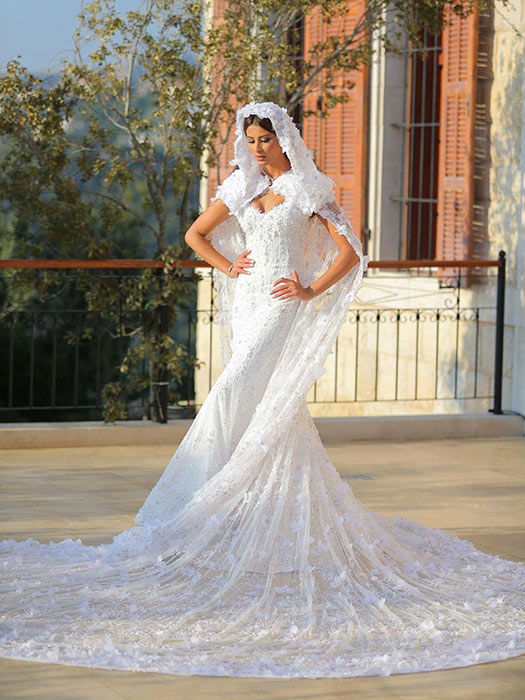For the fairytale occasion, Rym wore a breathtaking GEORGES HOBEIKA Couture bridal gown. Inspired by Andalusian nights and palatial celebrations, Rym’s gown was custom designed by GEORGES HOBEIKA, who crafted the dress to be an elegant, romantic expression of Rym’s character and strength. The reception's 1000 guests were captivated by Rym’s stunning appearance in a mermaid silhouette gown, reminiscent of GEORGES HOBEIKA’s Autumn-Winter 17/18 Haute Couture collection, which featured an extravagant hooded cape embroidered with crystals, multi-colored beads and silk organza flowers.