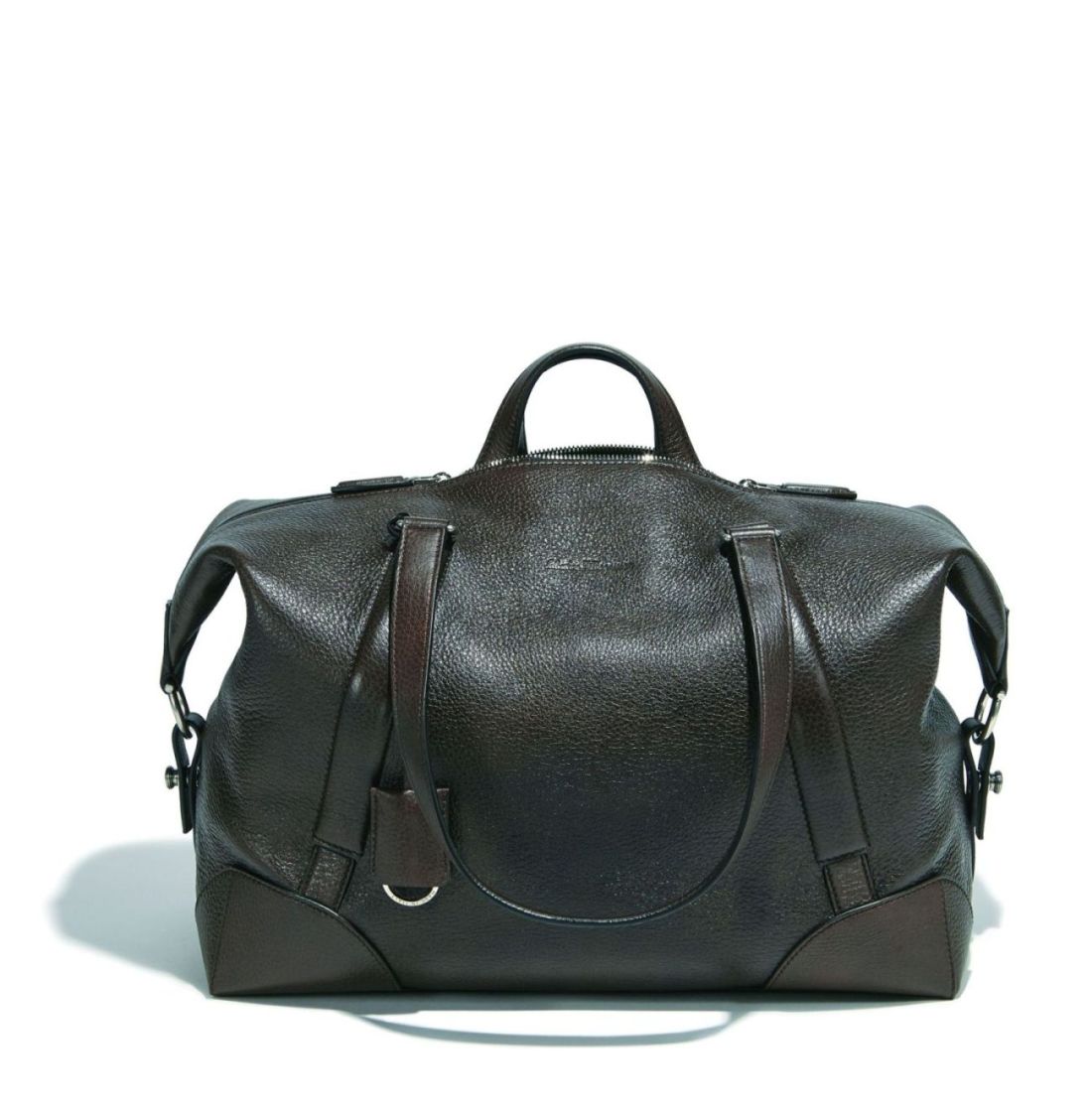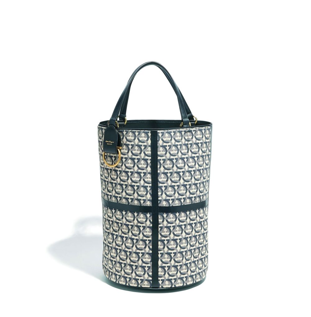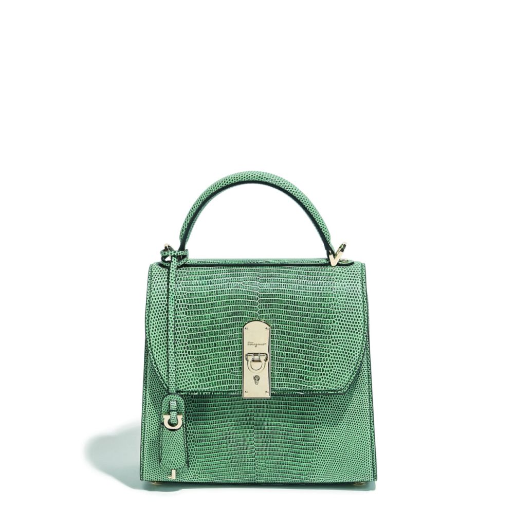 Patchworks of suede, nappa, snake and lizard in women’s accessories and ready-to-wear speak to this prevailing notion of multiplicity and allude to Mr. Ferragamo’s ubiquitous multicolor patchwork wedge of 1942. The same symbolic tactic is echoed in archival scarf prints in modern patchwork on silk twill. Fringed cashmere blanket coats, sensual leather robes, sportswear in Japanese technical wool and hand-knit textured sweaters convey a natural, unstudied luxury. The Gancini monogram jacquard, a new signature, visually locates the collection in a place and time without needing to tiredly assert a heritage.