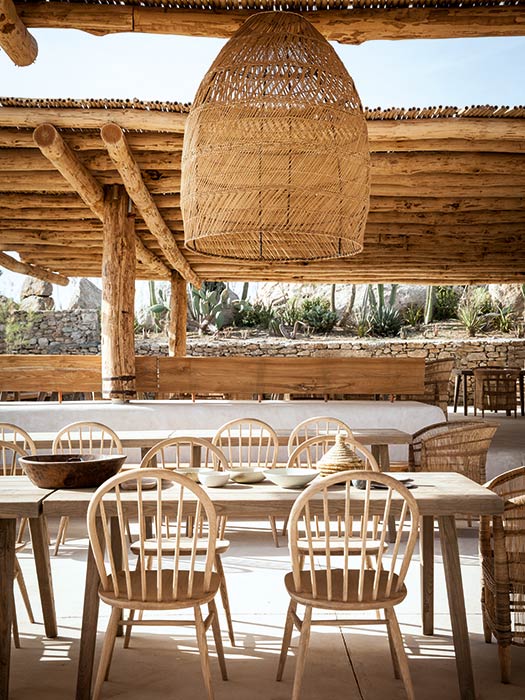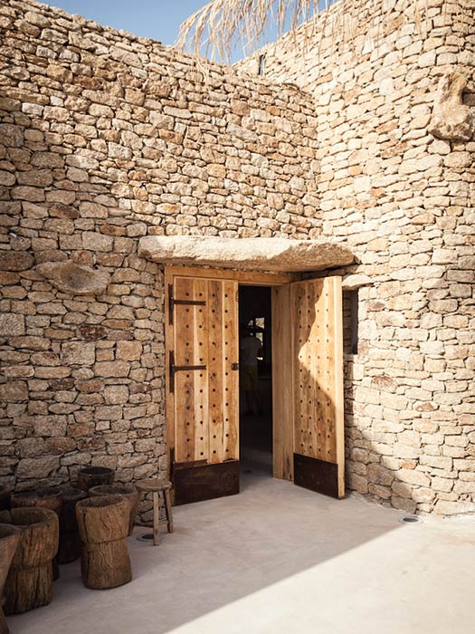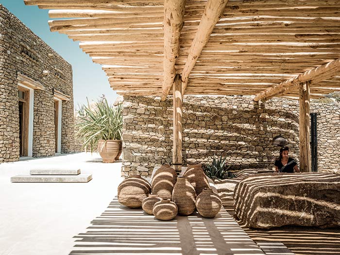 The beach area was transformed in the spirit of modern day agora, and was designed in the same spirit as the hotel, with stones, beams and bamboo, and it's also covered in white, to create a similar set. To keep this ancient and elemental spirit, urns and terracotta glazed stones and simple wooden furniture have been placed in open and closed spaces.